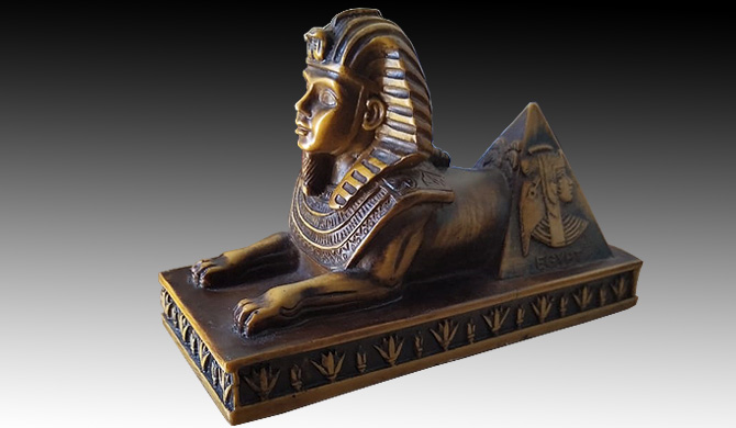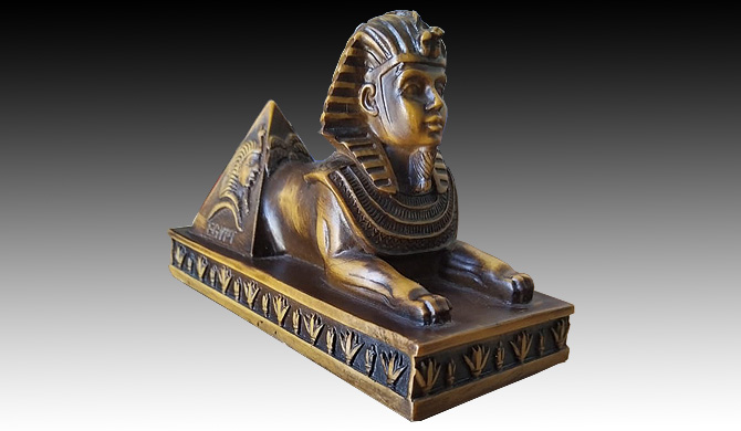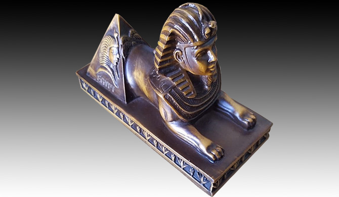A brown replica of the sphinx half statue with the pyramid on a base.